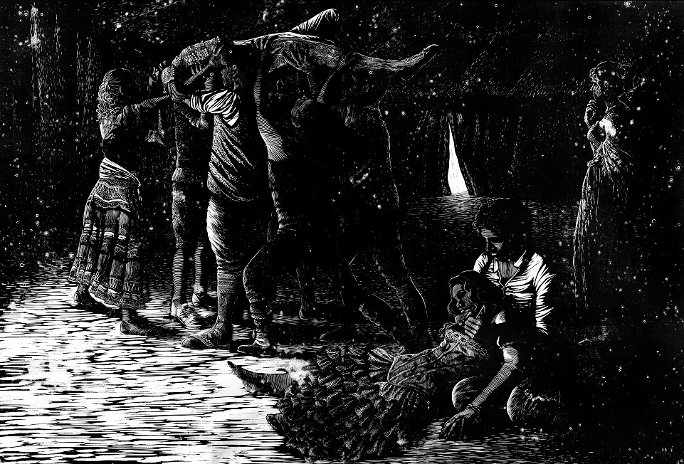 Luisa Almeida: o aspecto performático atravessa todo o processo de criação de Luisa, desde a música que escuta enquanto trabalha escavando a madeira, que, pelo grande formato de suas obras, exige uma performance corporal para poder observar o estado da obra, mas principalmente na hora de imprimir. Em geral, o processo de elaboração do trabalho atravessa vários estágios, desde os esboços, passando pela encenação de algumas poses que fotografa, até finalizar o desenho. Seu trabalho na exposição é inspirado na ópera do século XIX C’est Moi, C’est Toi” É Você, Sou Eu, em tradução livre), em que o personagem Don José esfaqueia e mata Carmen, a mulher que o recusou como amante por se sentir oprimida por seu ciúme asfixiante. Atualmente é mestranda em artes visuais na Universidade Estadual Paulista (Unesp), onde se graduou em 2017.