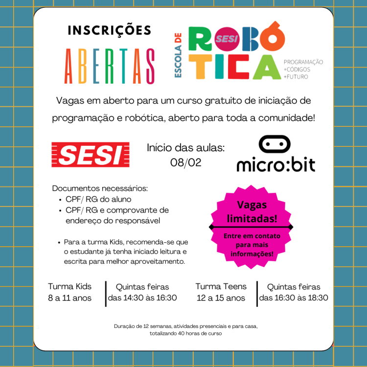 Neste curso, com duração de 40 horas, os participantes vão aprender conceitos básicos de programação, automação e princípios da robótica, atendendo às expectativas de aprendizagem contemporâneas, onde serão desenvolvidas as seguintes competências: Pensamento científico, crítico e criativo; Pensamento computacional (raciocínio lógico, lógica de programação); Resolução de situação-problema; Cultura Maker e projetos de autoria; Trabalho em equipe (colaboração, respeito, empatia, etc).Os interessados devem procurara a secretaria única do CAT SESI Itapetininga. E as vagas são gratuitas e limitadas.