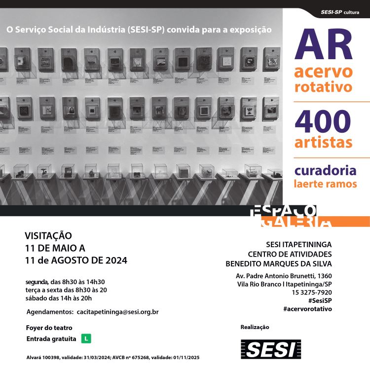 O Foyer do Teatro Sesi Itapetininga exibirá a exposição com artes de até 5 cm ‘Ar: Acervo Rotativo’, de 11 de maio a 11 de agosto de 2024. A visitação acontece de segunda-feira, das 08h30 às 14h30; terça a sexta-feira, das 08h30 às 20h; e sábado, das 14h às 20h.